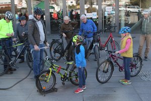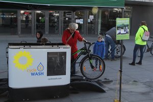 Nach der knapp einstündigen Radtour stellten die GRÜNEN für gut zwei Stunden ihre Fahrradwaschanlage an und boten damit eine wassersparende Möglichkeit, Fahrräder reinigen zu lassen. Hierbei wird das in der Anlage verwendete Wasser ständig gefiltert, sodass es im Umlaufverfahren immer wieder für weitere Waschgänge genutzt werden kann und kaum Abwasser entsteht. Es war somit gerade nach der langen dunklen Jahreszeit eine gute Gelegenheit, das eigene Fahrrad sauber erstrahlen zu lassen. Ein Großteil der Mitfahrenden auf der Radtour sowie zahlreiche weitere Gäste ließen ihr Fahrrad reinigen und verließen die Waschstation mit strahlenden Gesichtern. And die 100 Fahrräder sind so schätzungsweise an dem Nachmittag gereinigt worden.