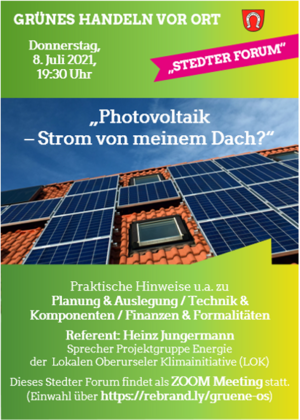 "Global denken, lokal handeln" – jeder Einzelne kann zum Klimaschutz beitragen. Mit der zweiten Veranstaltung der Informationsreihe „Stedter Forum“ wollen die Oberstedter Grünen interessierten Mitbürgern eine Möglichkeit geben, in kompakter und verständlicher Form praxisnahe Hinweise zu Planung, Installation und Betrieb einer Photovoltaikanlage zu bekommen. „Unter der Überschrift ‚Grünes Handeln vor Ort‘ haben wir uns das Ziel gesetzt, leicht zugängliche Informationen über umweltrelevante Aspekte im privaten Umfeld zu geben“, sagt Hans-Jürgen Klein, Ortsbeiratsmitglied der Grünen in Oberstedten.