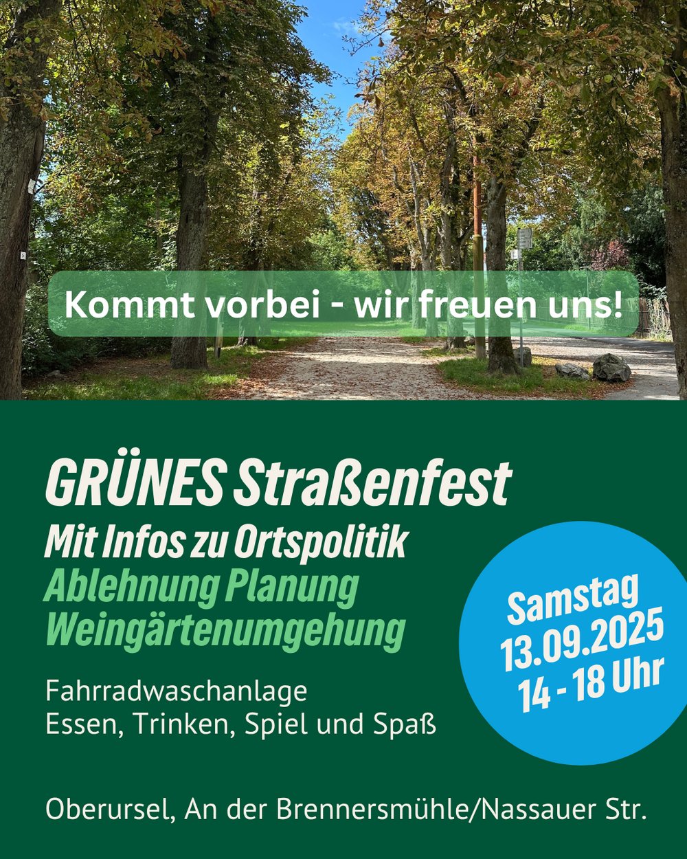 GRÜNES Straßenfest für die ganze Familie mit Infos zur Ortspolitik und zur grünen Ablehnung der Weingärtenumgehung. Mit Fahrradwaschanlage, Essen, Trinken, Spiel und Spaß. Kommt vorbei - wir freuen uns! Wann? Samstag, 13. September 2025, 14 bis 18:00 Uhr. Wo? An der Brennersmühle (verlängerte Nassauer Straße, Ecke Lindenstraße)