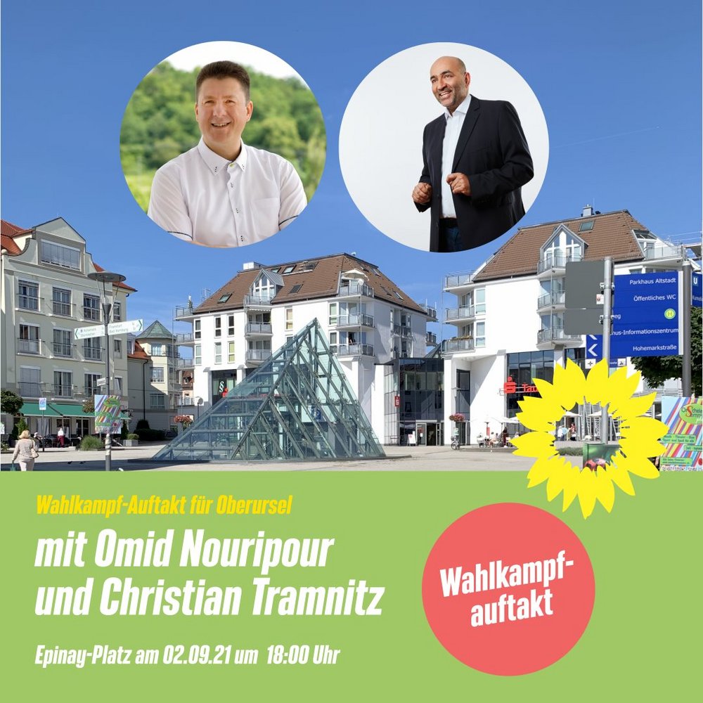 Unser "Wahlkampf-Auftakt zur Bundestagswahl von B90/Die Grünen Oberursel" findet am 02.09.21 um 18:00 Uhr auf dem Epinay-Platz in Oberursel statt. Gastredner sind Omid Nouripour, außenpolitischer Sprecher der Grünen Bundestagsfraktion, und Christian Tramnitz, Grüner Direktkandidat für den Bundestag (Hochtaunus, Wahlkreis 176). Besucher werden auf den Wahlkampf eingestimmt und erhalten Gelegenheit, den Politikern Fragen zu stellen. Alle Interessierten sind herzlich eingeladen, beim Auftakt dabei zu sein und am Austausch teilzunehmen. Die GRÜNEN Mitglieder und Wahlkampfhelfer, werden außerdem über die weitere Wahlkampfplanung informiert und mit den notwendigen Materialien für die heiße Wahlkampfphase versorgt. „Denn wir sind bereit, weil ihr es seid!“ gemäß dem GRÜNEN Wahlkampfslogan auch in Oberursel