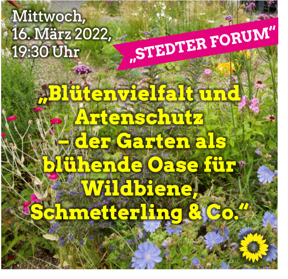 Die Tage werden merkbar länger, die Sonnenstrahlen locken nach draußen und die Gartengeräte stehen bereit… Der Jahreszeit entsprechend stellen die Oberstedter Grünen ihre nächste Ausgabe des „Stedter Forums“ unter das Thema Gartengestaltung und Artenvielfalt. Getreu dem Motto „Global denken – lokal handeln; der ökologische Beitrag jedes einzelnen zählt“, wendet sich diese Veranstaltung an alle, die ihren Garten durch eine bewusste Bepflanzung gleichzeitig bunter, abwechslungsreicher und insektenfreundlich gestalten möchten.