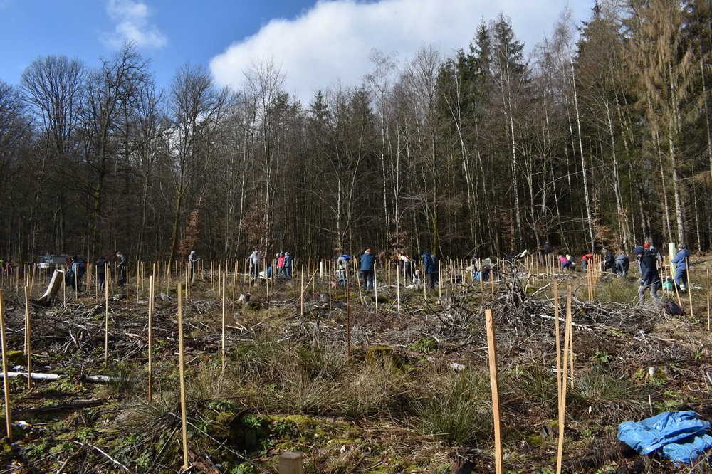Die Aktion wurde fachlich geführt vom Forstteam des BSO unter der Leitung des Revierförsters Luis Kriszeleit. „Wir verwenden zur Nachpflanzung aktuell klimaresistente Arten und setzen auf das Entstehen von Mischwäldern“ stimmt Förster Kriszeleit die Gruppe auf den Tag ein. Zur Pflanzung kamen Spitzahorn, Bergahorn, Flatterulme, Winterlinden, Vogelkirsche, Speierling, Elsbeere, Wildbirne und Wildapfel, Weißtannen, Douglasien und Eibe. Die Vogelkirsche, der Speierling und die Elsbeere gehören zum Wildobst und sind früchtetragende Edellaubhölzer. Das Wildobst dient Wildtieren, wie z.B. Mardern, Dachsen, Igeln, Bilchen sowie Insekten (Bienenweide) als Nahrung und ist deshalb ökologisch sehr wertvoll. „Wir sind sehr froh über die Unterstützung und den Einsatz der Bürger:innen. Aus eigenen Ressourcen würden wir solch ein Ergebnis an einem Tag nicht schaffen“, so Kriszeleit weiter.