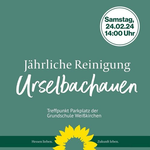 Unsere jährliche Bachreinigung der Urselbachauen findet am 24. Februar 2024 statt. Alle naturinteressierten Bürger laden wir zur Bachreinigung der Urselbachauen, zwischen der Grundschule Weisskirchen und der Krebsmühle ein. Alle freiwilligen Helfer, ob Groß und Klein, sind willkommen. Treffpunkt ist am Samstag, den 24. Februar, am Parkplatz der Grundschule Weisskirchen. Müllsäcke werden gestellt, warme und wasserfeste Kleidung sind mitzubringen. Treffpunkt ist um 14 Uhr am Parkplatz hinter der Grundschule (über Urselbachstraße in die Strasse „An der Untermühle“ einbiegen). Wir bitten um Anmeldung unter mitmachen@gruene-oberursel.de - vielen Dank!
