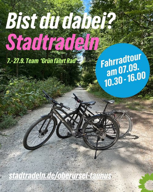 Unser Team „GRÜN fährt Rad!“ radelt vom 07. September bis zum 27. September wieder für das Klima. Alle, die in Oberursel wohnen, arbeiten oder eine (Hoch-)Schule besuchen, können sich für das Team „GRÜN fährt Rad!“ Team anmelden. Während der dreiwöchigen Aktionsphase gibt jede Radler:in die zurückgelegten Kilometer über den Online-Radelkalender ein. Die Leistungen der Teams sowie Kommunen werden auf der Stadtradeln-Homepage öffentlich dargestellt. Ergebnisse einzelner Teilnehmer:innen werden nicht veröffentlicht. Vor Ort werden die aktivsten Radler:innen und/oder Teams durch die Kommune prämiert.
