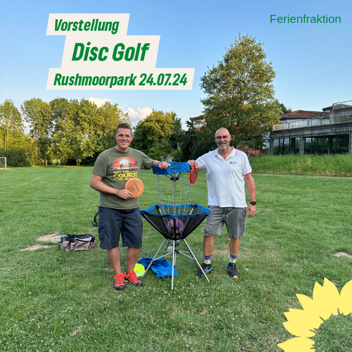 Am Mittwochabend kamen über 30 Interessierte zur Vorstellung der jungen Sportart Disc Golf in den Rushmoorpark und folgten einer Einladung der Grünen Oberursel im Rahmen ihrer Ferienfraktion. Die beiden Disc Golf Enthusiasten André Klenner aus Oberursel und Jürgen Weidner, Geschäftsführer des Frisbeesport-Landesverband-Hessen e.V., hatten 4 mobile Körbe aufgebaut und erklärten die Sportart, ihre Verbreitung, das Material, die Regeln und den rücksichtsvollen Umgang der Spieler untereinander und mit dem Umfeld. Beim Disc Golf wird eine spezielle Frisbeescheibe, genannt Disc, mit möglichst wenig Würfen in einen Fangkorb geworfen. Wie beim Golf gilt es, einen festgelegten Kurs mit einzeln Bahnen zu absolvieren. Alles was man als Spieler an Ausstattung benötigt, sind die Discs, als Anfänger reicht oftmals für längere Zeit ein Set im Wert von unter 30 Euro.