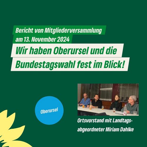 Bei der Mitgliederversammlung der GRÜNEN Oberursel am Mittwoch 13.11.24 ging es um die Stadtpolitik der jüngsten Zeit sowie die anstehende Bundestagswahl und den Wahlkampf.