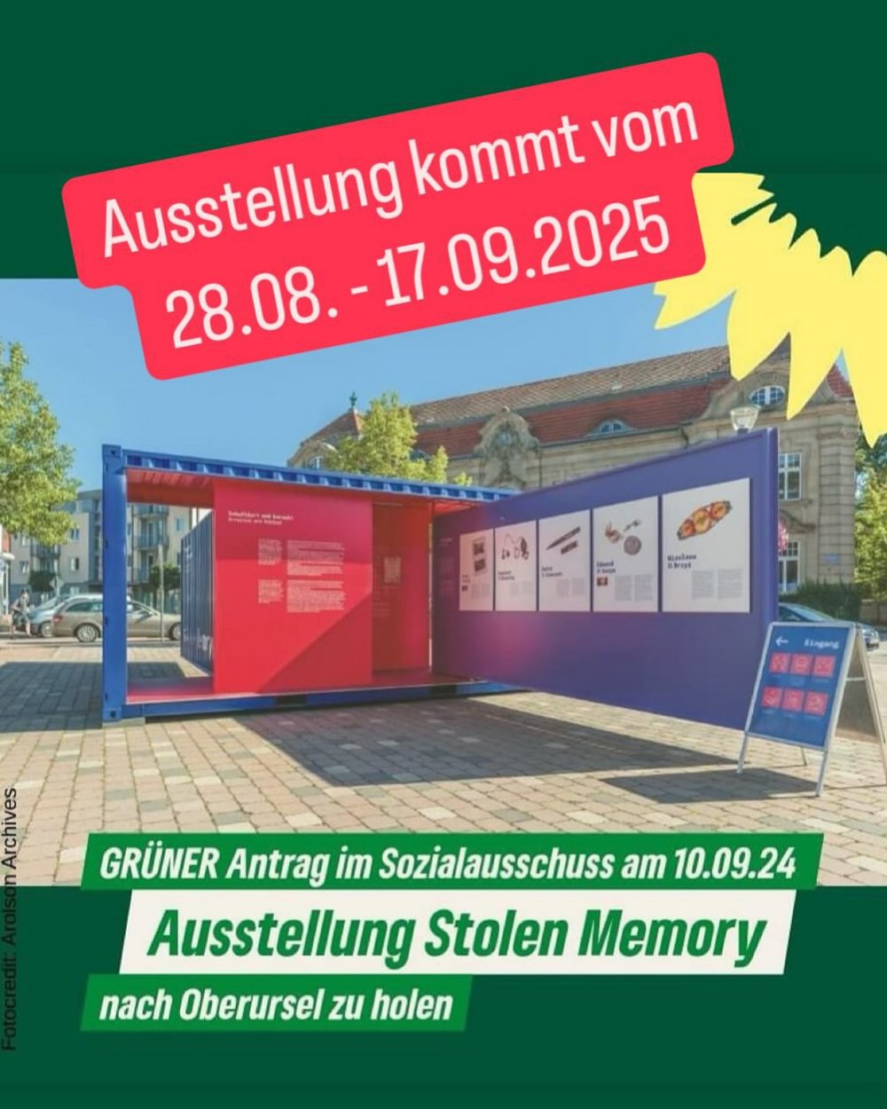 Gute Zusage, dass die bedeutende Wanderausstellung Stolen Memory im Zeitraum vom 28. August bis 17. September 2025 in Oberursel zu sehen sein wird. Unsere Grüne Fraktion hatte sich aktiv für die Ausstellung stark gemacht und und diese im Stadtparlament beantragt.