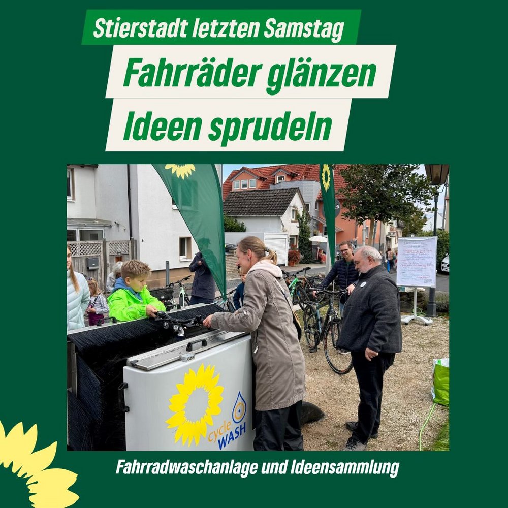 Am Samstag, den 27. September 2025, lud die Ortsgruppe der Grünen Stierstadt zu einer ansprechenden Aktion auf den Heinrich-Geibel-Platz ein: Eine professionelle Fahrradwaschanlage sorgte bei vielen Besucherinnen und Besuchern für blitzende Räder und große Begeisterung.