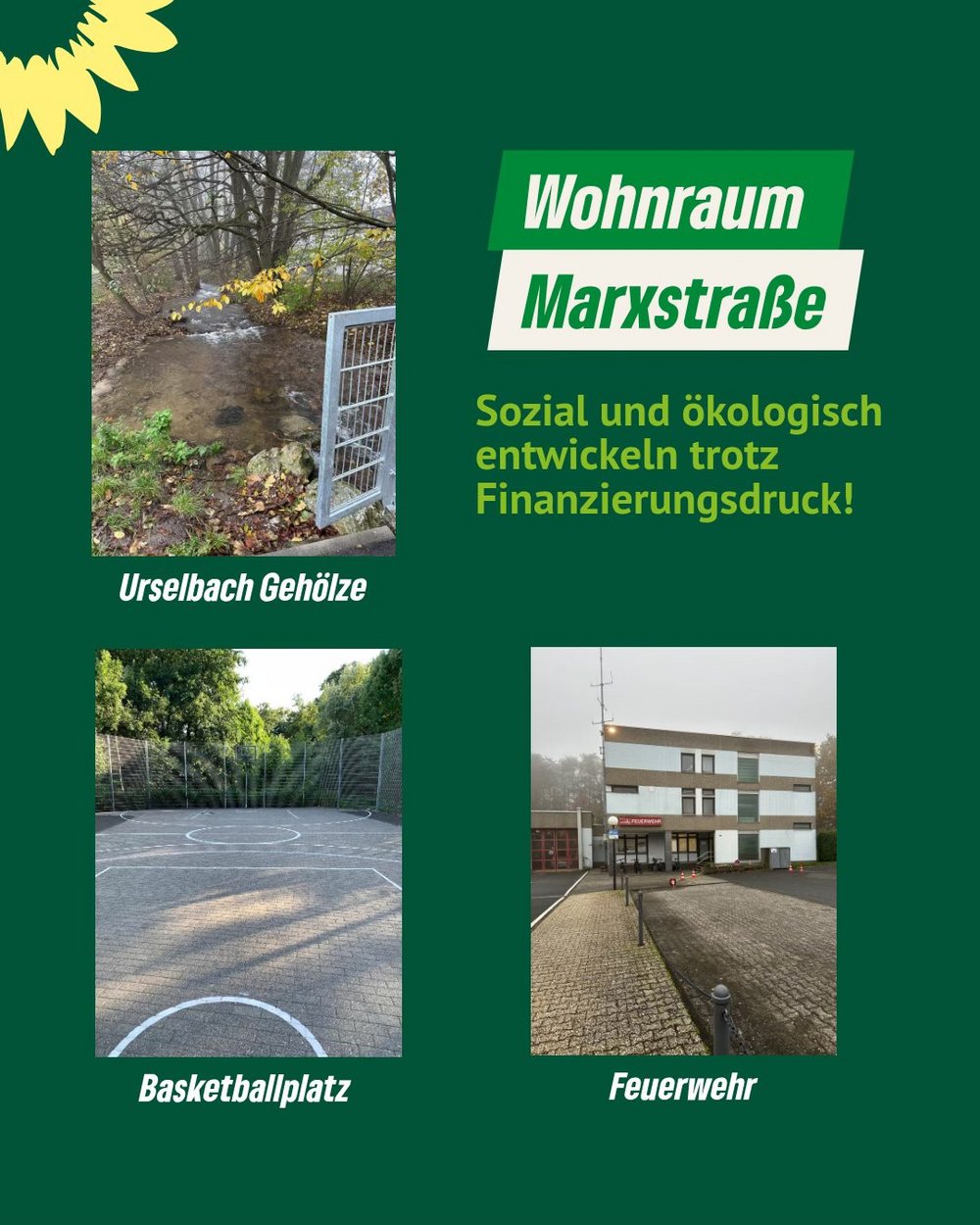Die Stadt Oberursel plant mit dem Bebauungsplan Nr. 265 die Entwicklung von Wohnbauflächen in der Marxstraße 24–30. Die GRÜNEN unterstützen grundsätzlich das Ziel, dort neuen Wohnraum zu schaffen und das Gefahrenabwehrzentrum aus dem Grundstückserlös zu finanzieren. Allerdings dringen die GRÜNEN darauf, soziale und ökologische Standards einhalten. Die Koalition verzichtet auf diese Standards mit dem Argument, dass der Grundstücksverkauf zur Finanzierung des GAZ größtmöglich beitragen muss.